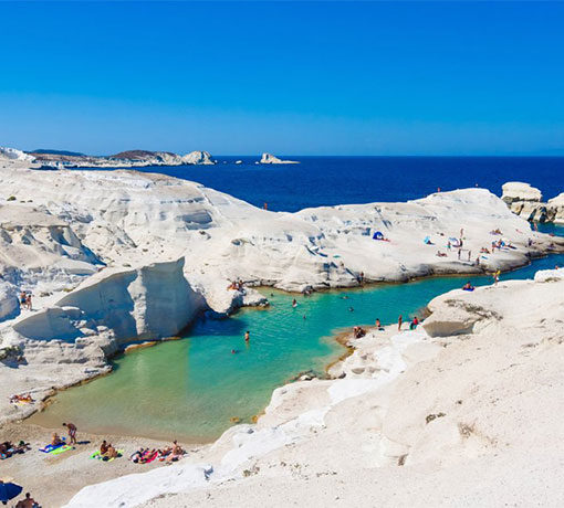 Plaka is a classic Cycladic village with white stone houses and bougainvillea flowers, perched 250 meters above the Aegean. You will walk through the village to admire its traditional architecture and its stunning view over the bay of Adamas, and you will taste some homemade desserts at the village’s local pastry shops. From there, you will head to the village of Trypiti, where the early Christian Catacombs lay along with the ruins of the ancient city of Klima. On the way to the Catacombs, we shall also visit the site where Venus de Milo was discovered in 1820. From the archaeological site, you will continue to the port of the ancient city of Milos is now the fishing village of Klima. The colorful doors and the seafront create a picture that summarizes the essence of a Greek island! After a day of sightseeing, indulge in a cool swim and drinks in the crystal waters of Palaiochori or Provatas beach. Each beach offers changing facilities, beach bars and restaurants. (Water sports in Palaiochori).