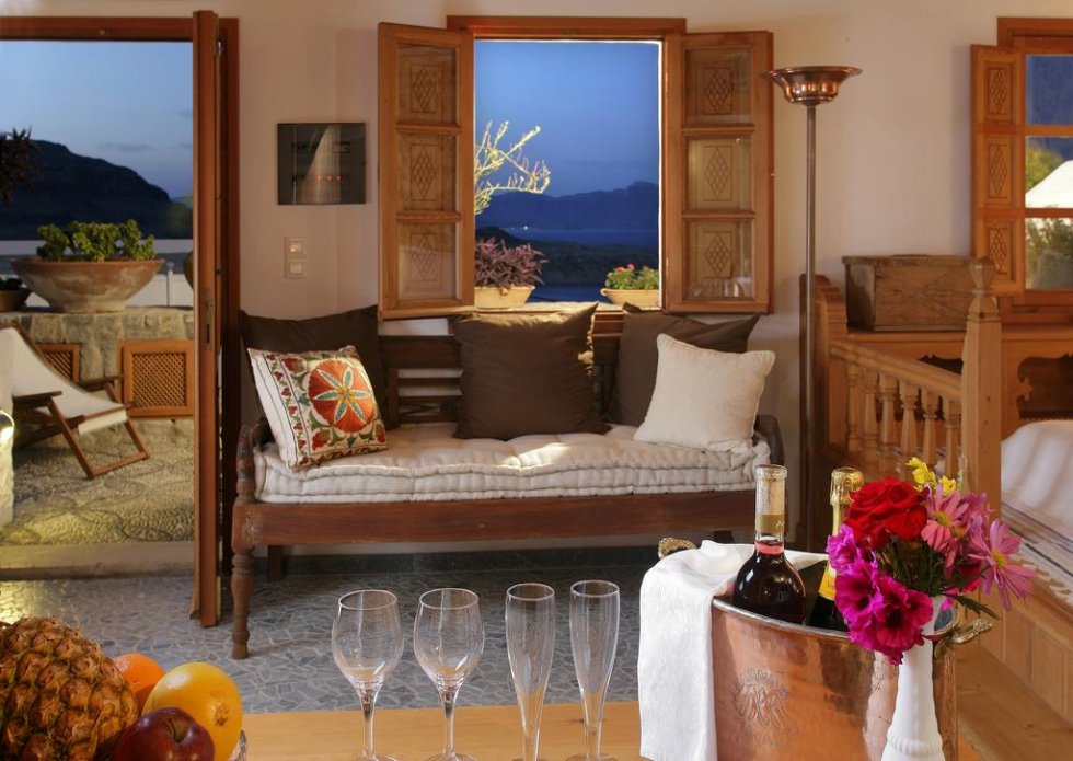 Melenos Lindos has a spectacular setting of nature and history for its distinctive accommodation: it nestles within the high rocky flank of the ancient Acropolis of Lindos and offers a panorama of the Aegean Sea and distant coastline.