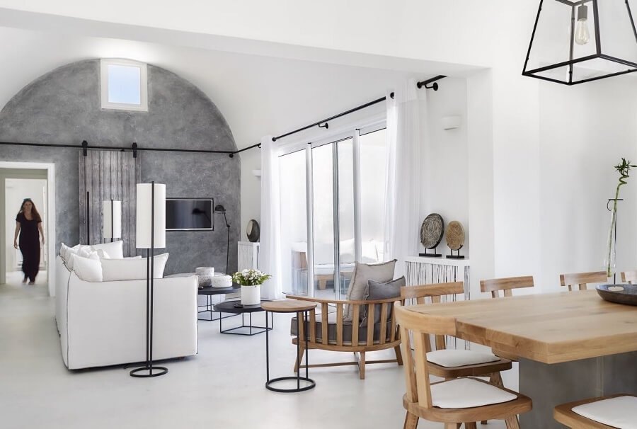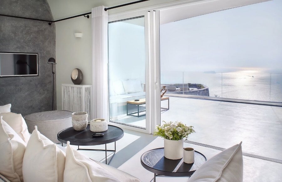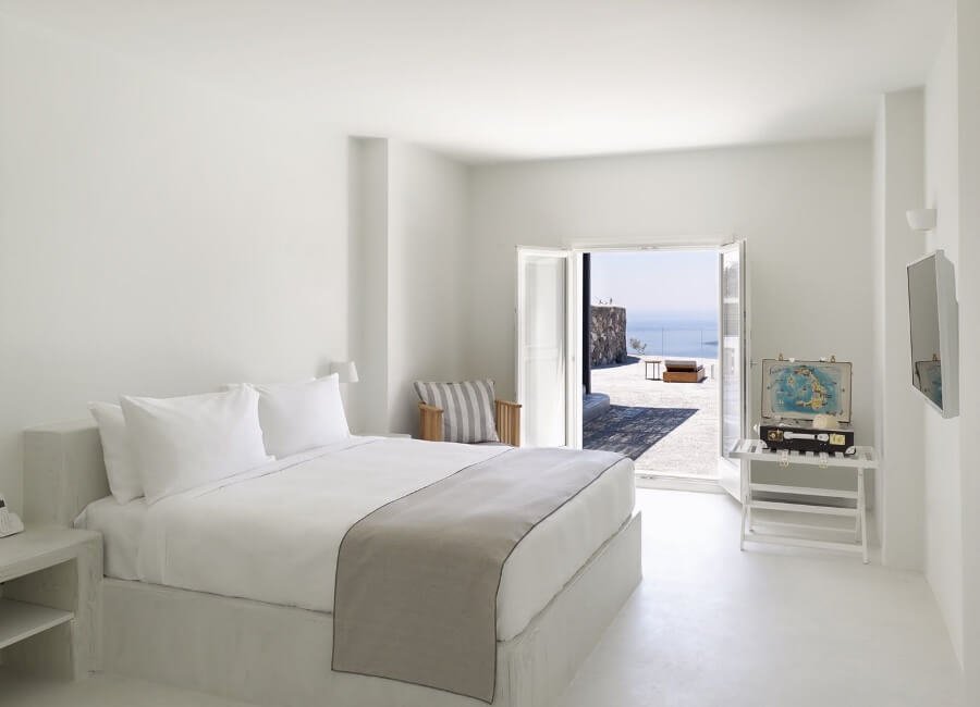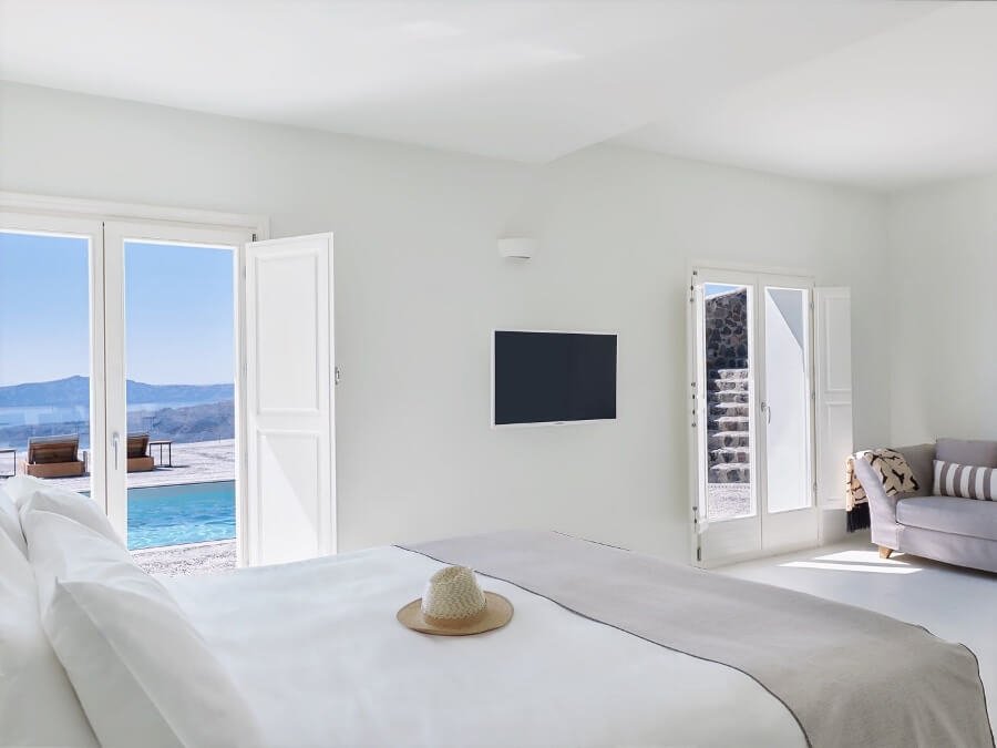 Combining Cycladic architecture with modern design, Nafsika Estate is a wonderful architectural gem of minimal style in a quiet area of Santorini’s Caldera, surrounded by nothing but the wild beauty of the island’s nature. The Estate’s minimal design, the privacy and calmness of this secluded area, the sea’s peaceful sounds and the mesmerizing volcano views complete the Estate’s tranquil ambiance. A majestic estate with 5 bedrooms distributed between 2 levels, connected by both indoor and outdoor stairs.