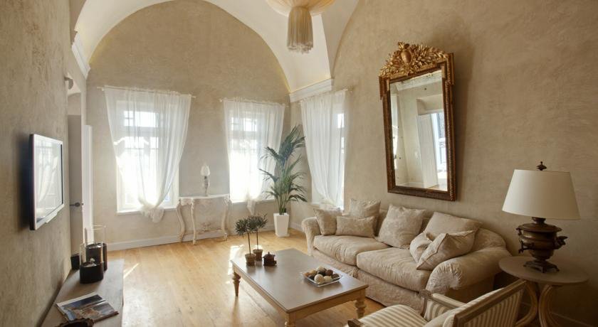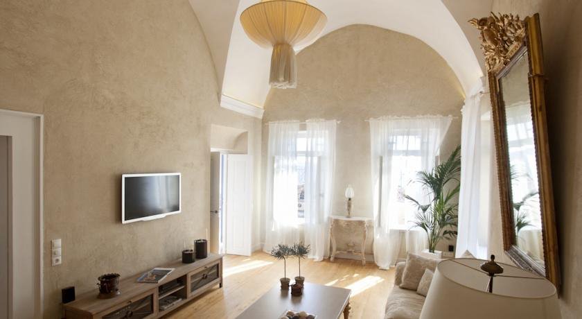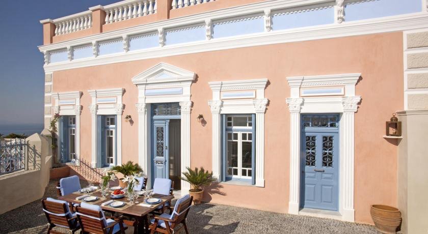 Recently renovated to state of the art, Oia Mansion in Oia Santorini, retains its authentic Sea-Captain house glorious ambiance: ornamented facade, spacious living room, the vaulted ceilings, epoch chandeliers, hand-finished oak floors with the irregular size strips, rare antique furniture, Venetian mirrors etc. Hand-finished “built-in” beds, sofas and tables in organic shapes, sculptured forms and fluid lines.
