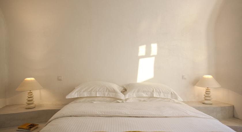 Plastered walls recreate the caldera’s texture in colors ranging from bright white to earthly, elegant pastel hues. Fine screeds on the floors, lime paints and lime washes on the interior and exterior walls, natural materials based on mineral hydraulic binders, mineral aggregates and colored earths. All elements participate in a charming game of comfort, discreet luxury and quiet sophistication.